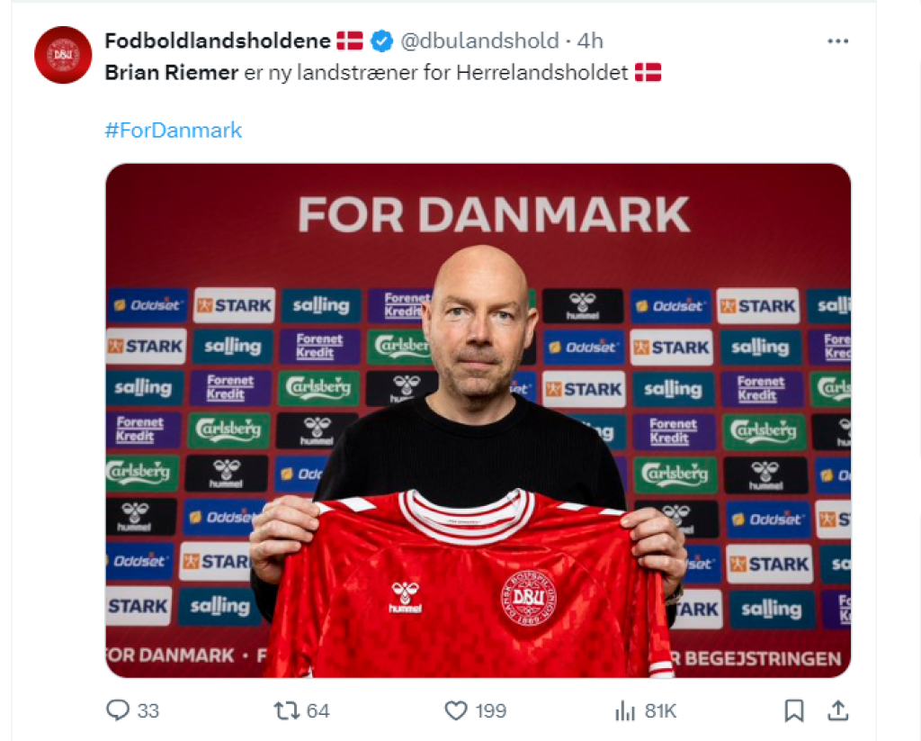 DBU har bekræftet, at Brian Riemer bliver Danmarks nye landstræner. Han er ansat frem til og med VM i 2026 og overtager efter Lars Knudsen, der har fungeret som midlertidig træner. Riemer kommer til uden overgangssum, da han blev fyret af RSC Anderlecht i september.